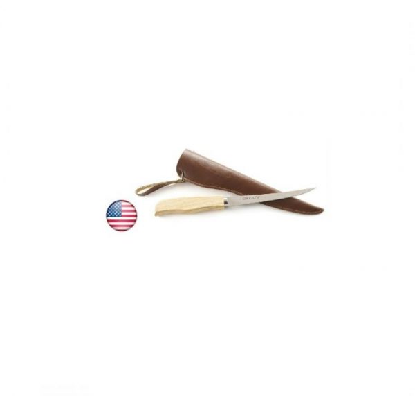 Cuchillo Filetero de acero inoxidable, largo de la hoja 15cm. Cacha de madera y cartuchera de Eco Cuero.