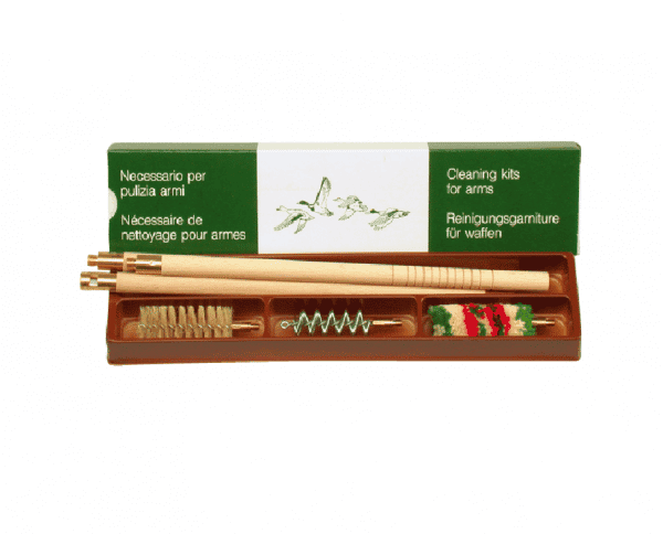 Baqueta de madera, formada por tres piezas que se atornillan, con refuerzo de bronce en las puntas. Incluye: 3 escobillas, una de